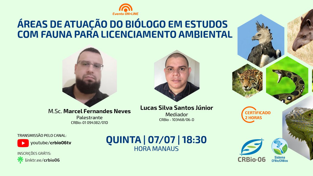 INSCRIÇÕES PELO SYMPLA: https://www.sympla.com.br/areas-de-atuacao-do-biologo-em-estudos--com-fauna-para-licenciamento-ambiental__1617298