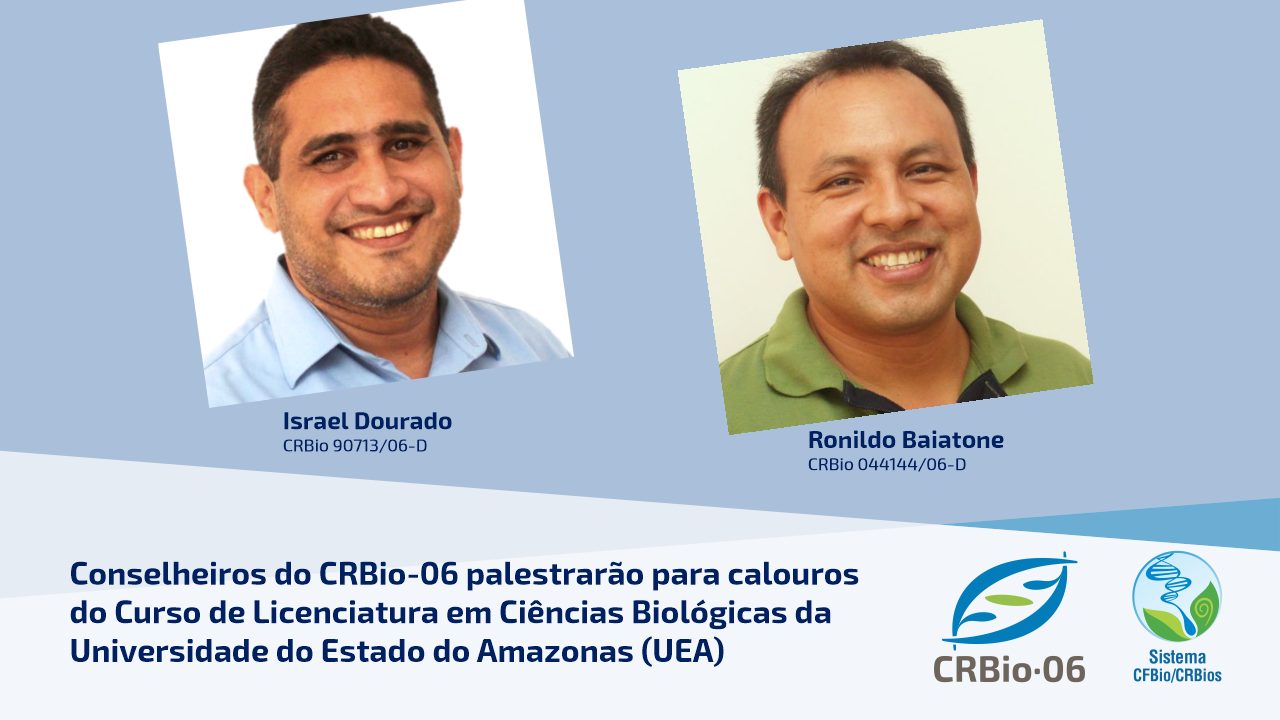 A convite da Universidade do Estado do Amazonas (UEA), os Conselheiros do CRBio-06, Israel Dourado, Coordenador da Comissão de Fiscalização e Exercício Profissional (COFEP) e Ronildo Baiatone, Coordenador da Comissão de Formação e Aperfeiçoamento Profissional (CFAP), ministrarão palestras com o tema O Papel do Biólogo na Sociedade, aos calouros do Curso de Licenciatura em Ciências Biológicas. Os eventos fazem parte das comemorações do Dia do Biólogo e serão na modalidade à distância, nos dias 3 com Israel Dourado e 6 de setembro com Ronildo Baiatone, ambos com início previsto para as 20:00 horas (horário de Manaus. O CRBio-06 agradece a UEA pelo convite na pessoa da Bióloga, Profa. Dra. Larissa Kirsch Barbosa, Coordenadora do Curso de Ciências Biológicas - ESN/UEA e parabeniza todos os Biólogos e Biólogas pela passagem do seu dia.