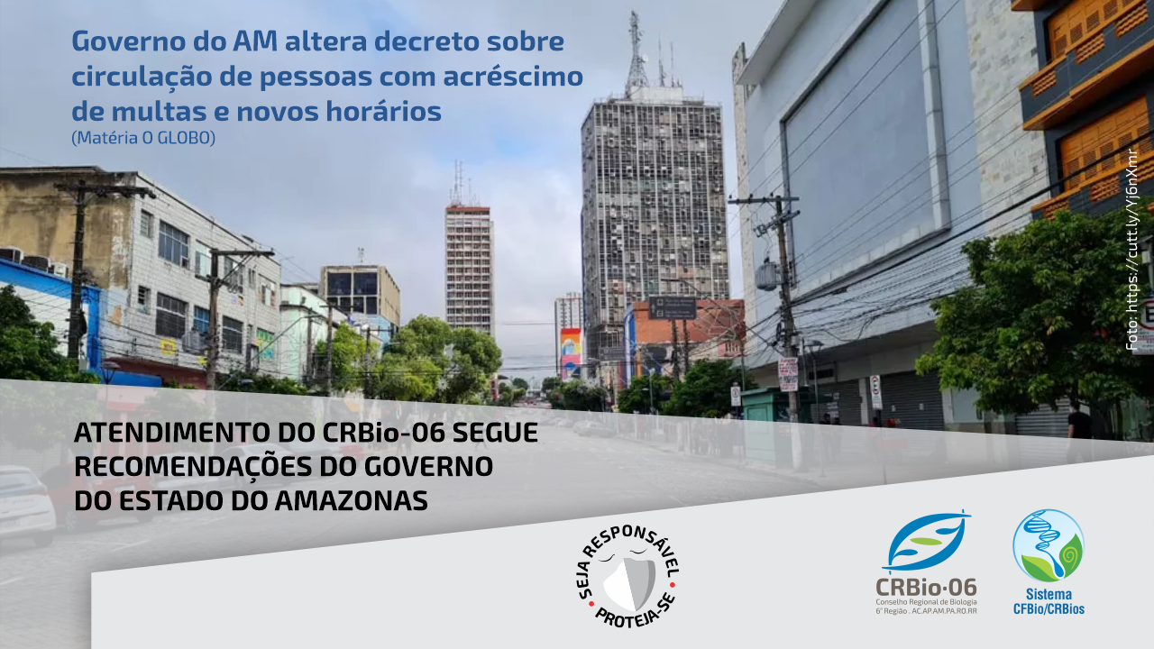 O CRBio-06, continua atendendo todas as recomendações, quanto a preveção e medidas de contenção ao coronavírus. Apenas os serviços on-line do nosso site e nossos canais de atendimento: telefone, e-mail, aplicativo de mensagem, chat e formulário de mensagem no site continuam em pleno funcionamento, em função do regime de teletrabalho executado por nossos funcionários em home-office. Nosso horário de atendimento não-presencial é de segunda a sexta, das 9:00 às 17:00, exceto feriados. Veja a matéria do jornal O GLOBO sobre o decreto governamental que restringe a circulação de pessoas, e o funcionamento dos estabelecimentos até o próximo dia 31 de janeiro. Leia a matéria em: https://g1.globo.com/am/amazonas/noticia/2021/01/26/governo-impoe-multas-e-estabelece-horarios-em-mudancas-no-decreto-sobre-circulacao-de-pessoas.ghtml
